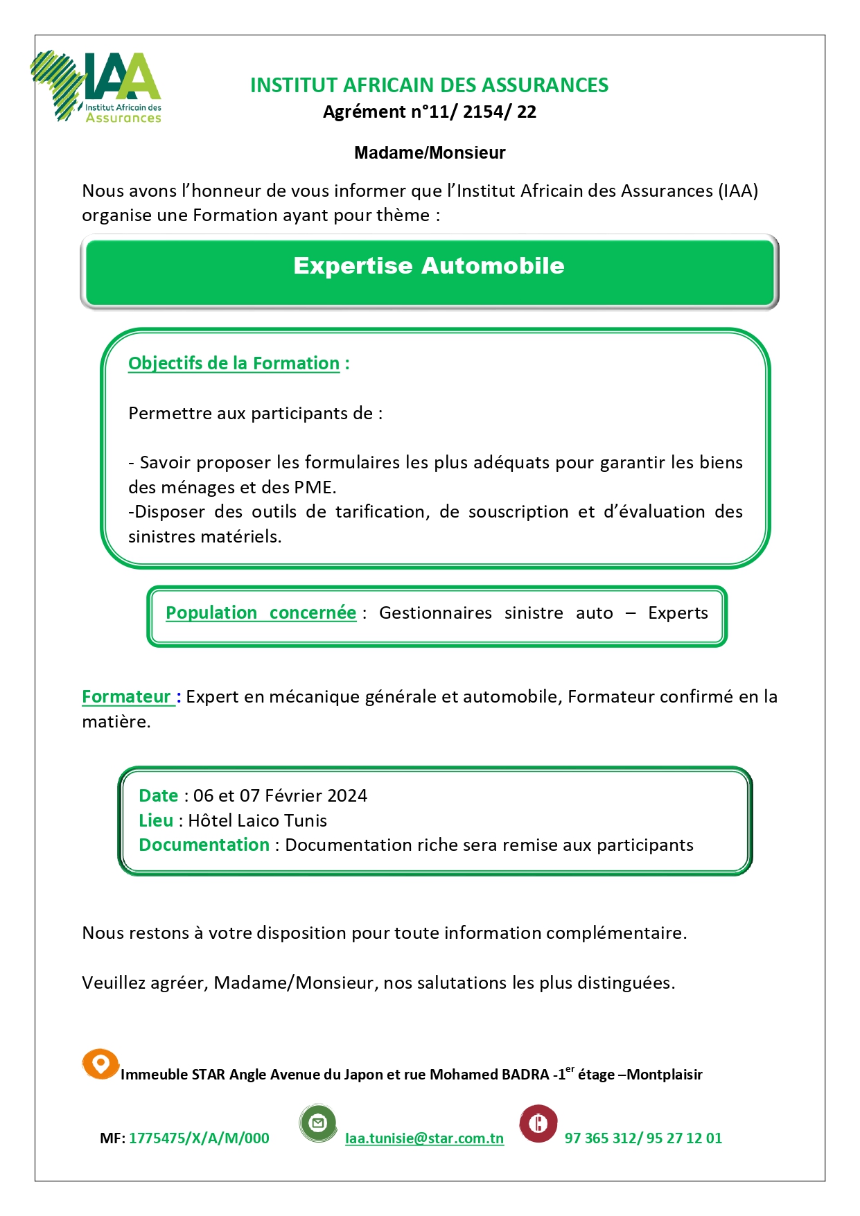 Séminaire ayant pout thème " Evaluation technique et tarification des risques RC Décennale" assurée le 17 et 18 AVRIL 2024 à l'hôtel LAICO TUNIS